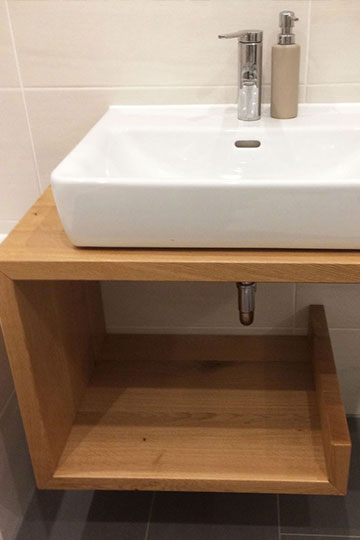 Waschtisch in Eiche massiv in offener Ausführung. Die Oberflächen können geölt (wasserabweisend) oder lackiert werden (wasserfest). Auch bei einer Lackierung bleibt die Haptik der Oberfläche erhalten.